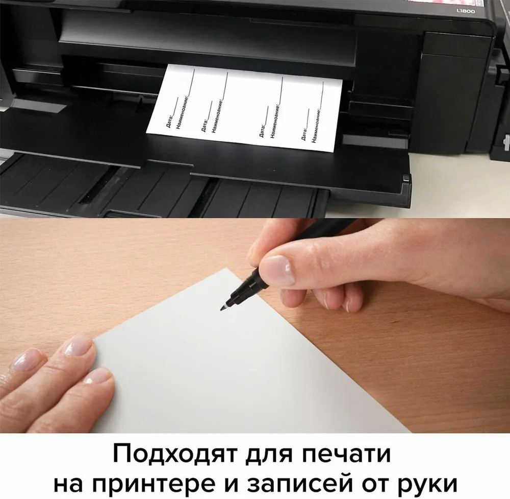 Изготовлены из матовой бумаги белого цвета плотностью 70 г/м2. Картонная упаковка содержит 50 листов формата А4, на каждом листе — двенадцать этикеток размером 105×48 мм.
