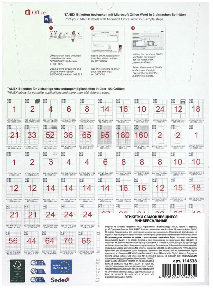 💳 Оплатить за товар можно при получении 🇰🇿 Есть бесплатная доставка по Казахстану от 1 дня 🎁 Копите бонусы с каждой покупки Серия: Universal Универсальные самоклеящиеся этикетки Tanex производятся из высококачественного сырья ведущего европейского производителя UPM-Kymmene Финляндия. Самоклеящиеся этикетки позволят быстро и качественно подготовить адресные наклейки, регистрационные номера, аннотации при помощи лазерного или струйного принтера. |