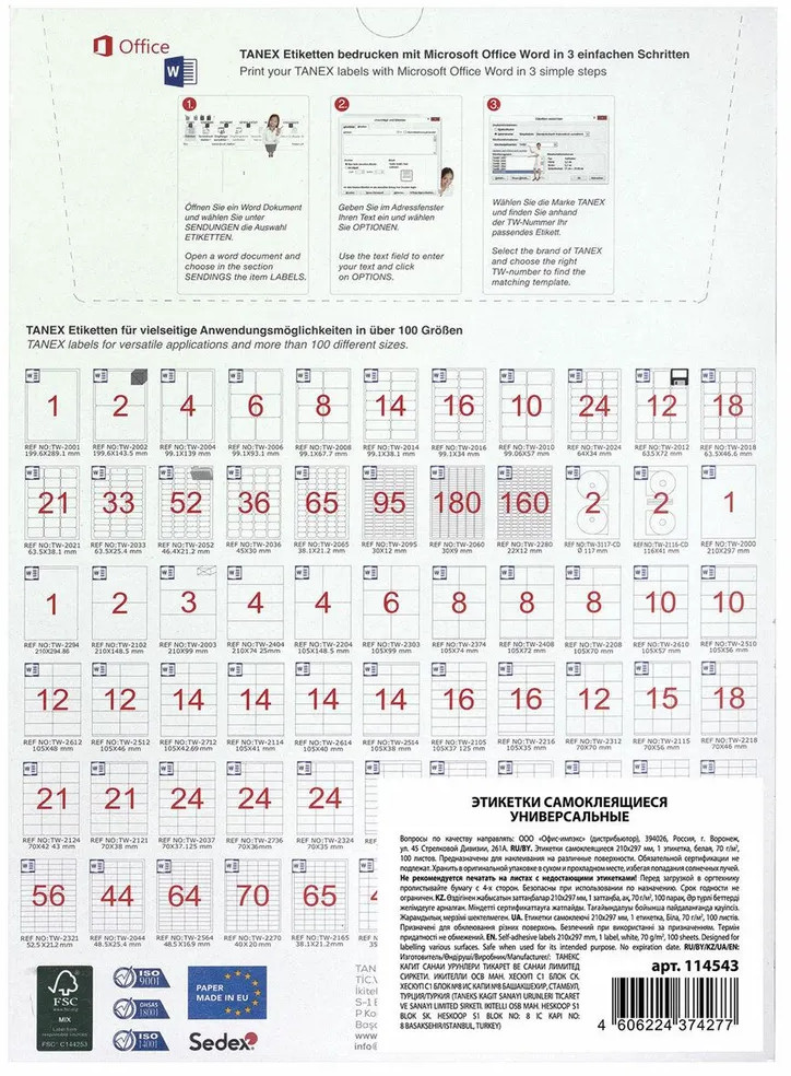 💳 Оплатить за товар можно при получении 🇰🇿 Есть бесплатная доставка по Казахстану от 1 дня 🎁 Копите бонусы с каждой покупки Серия: Universal Универсальные самоклеящиеся этикетки Tanex производятся из высококачественного сырья ведущего европейского производителя UPM-Kymmene, Финляндия. Самоклеящиеся этикетки позволят быстро и качественно подготовить адресные наклейки, регистрационные номера, аннотации при помощи лазерного или струйного принтера. |