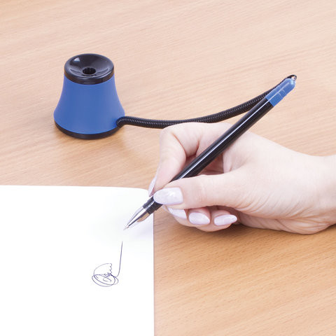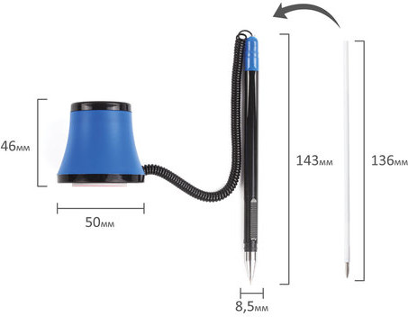 Brauberg Ручка шариковая настольнаяВ данный момент этот товар отсутствует в продаже. Возможно, у нас найдется аналогичный или похожий товар здесь. Настольная шариковая масляная ручка BRAUBERG «Стенд-Пен № 1» с оригинальным дизайном прекрасно впишется в интерьер любого офиса, информационного бюро и т.д. Корпус ручки прозрачный, подставка и детали ручки выполнены из пластика черного и синего цветов. Ручка крепится к подставке с помощью пружинки и фиксируется на любой ровной поверхности с помощью клейкого основания и с регулируемым углом наклона. Длина стержня составляет 136 мм. Диаметр основания — 5 см. Создает линию письма толщиной 0,35 мм. Цвет чернил — синий. |