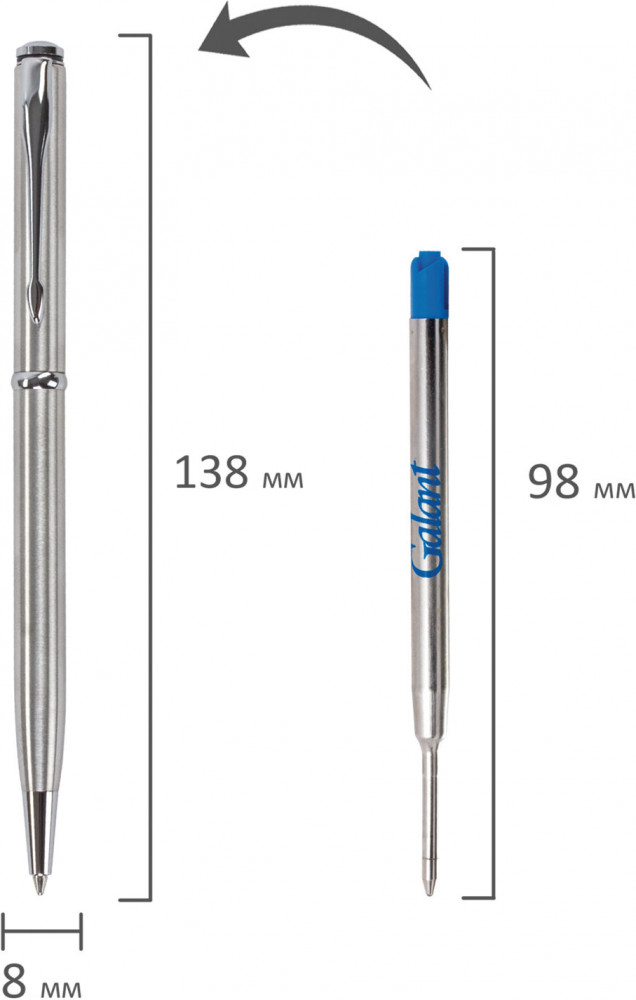 💳 Оплатить за товар можно при получении 🇰🇿 Есть бесплатная доставка по Казахстану от 1 дня 🎁 Копите бонусы с каждой покупки Серия: Arrow Изящная ручка Galant «Arrow Chrome» станет отличным подарком к любому празднику или событию, подчеркнет статус и изысканность вкуса владельца. Элегантная тонкая модель ручки с корпусом из латуни серебристого цвета и хромированными деталями прекрасно лежит в руке и не скользит. Синий цвет чернил, длина стержня составляет 98 мм, а диаметр пишущего узла — 0,7 мм. Поставляется в индивидуальном подарочном футляре. Подходит для гравировки. Стиль и изысканность, роскошь и практичность, совершенство снаружи и внутри — всем этим требованиям достойно отвечает продукция Galant. |