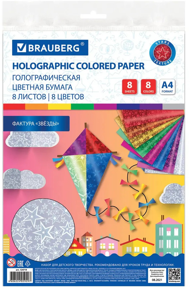 💳 Оплатить за товар можно при получении 🇰🇿 Есть бесплатная доставка по Казахстану от 1 дня 🎁 Копите бонусы с каждой покупки Набор цветной бумаги со спецэффектами Brauberg предназначен для творчества, хобби, моделирования, оформления презентаций как любителями, так и профессионально занимающимся людям. Набор голографической односторонней цветной бумаги (рисунок — звезды) плотностью 80 г/м2 включает 8 листов формата А4 (210 × 297 мм) в 8-ми разнообразных и насыщенных однородных цветах. Листы упакованы в полиэтиленовый пакет с липким краем, легко режутся и сгибаются. |