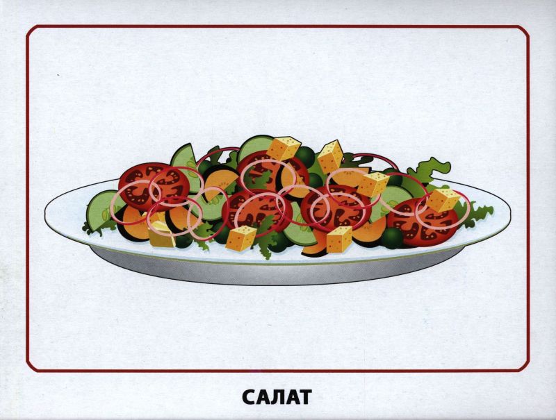 Большие и яркие картинки на белом фоне: бутерброд, каша, салат, фрукты, кофе, овощи, пицца, суп, икра, пирог, чай, сыр, сок, молоко, мороженое, вода. Очень помогают при изучении данной лексической темы.