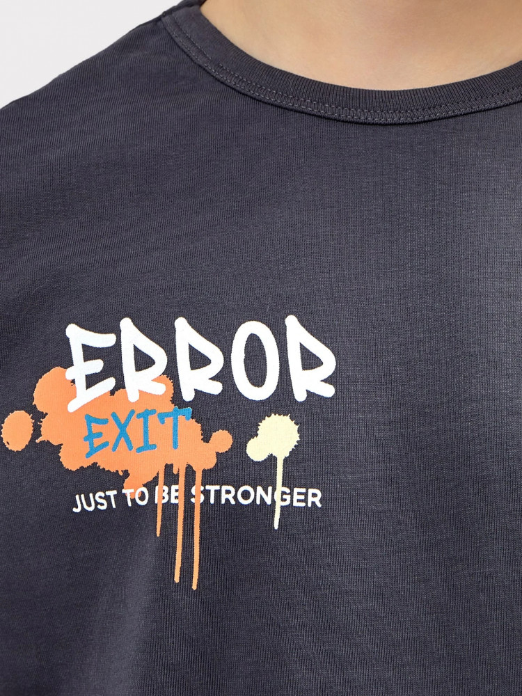 Цвет полотна футболки и брюк отличаются.Футболка более графитового цвета, брюки светлее на тон с добавлением коричневого оттенка. Так же отличаются по яркости краски аппликации, на футболке более яркие,особенно оранжевая и белая. Полагаю за счет разных по плотности тканей из которых пошит комплект, они красились в разное время.