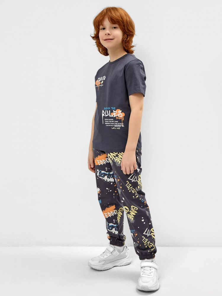 Цвет полотна футболки и брюк отличаются.Футболка более графитового цвета, брюки светлее на тон с добавлением коричневого оттенка. Так же отличаются по яркости краски аппликации, на футболке более яркие,особенно оранжевая и белая. Полагаю за счет разных по плотности тканей из которых пошит комплект, они красились в разное время.