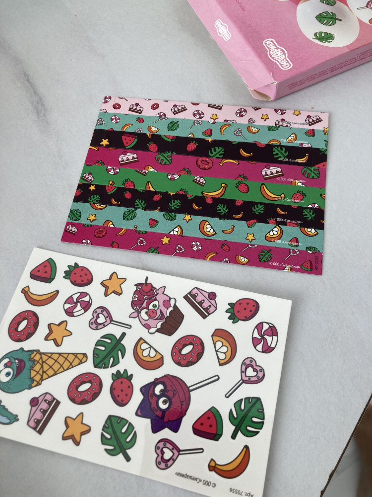 В наборе 2 листочка 5*8 см наклейки и полоски для подставки бумажные. Набор для малышей. Однозначно цена завышена.