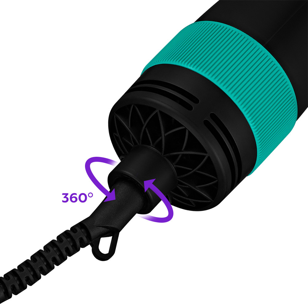 Шнур оснащён защитой от перегиба, что увеличивает срок службы устройства. Вращение шнура на 360°обеспечивает удобство в использовании — провод не наматывается и не путается при перевороте щетки, а поворачивается вместе с ним.