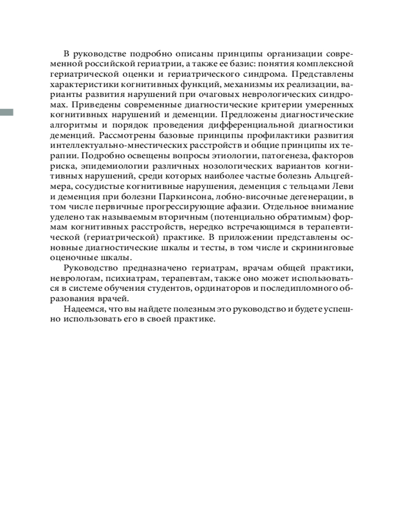 💳 Оплатить за товар можно при получении 🇰🇿 Есть бесплатная доставка по Казахстану от 1 дня 🎁 Копите бонусы с каждой покупки Серия: Библиотека врача-гериатра В руководстве подробно рассмотрены принципы организации современной российской гериатрии, а также ее базис: понятия комплексной гериатрической оценки и гериатрического синдрома. Представлены характеристики основных когнитивных функций, даны критерии диагностики и классификация когнитивных нарушений. Описаны алгоритм дифференциальной диагностики когнитивных расстройств, общие принципы и направления их профилактики и лечения. Дополнительно изложены современные представления об этиологии, патогенезе, особенностях клинических проявлений, возможностях диагностики и лечения основных нозологических форм (болезнь Альцгеймера и другие нейродегенеративные заболевания, цереброваскулярная болезнь и др.). В приложении приведены основные диагностические шкалы и тесты, в том числе и скрининговые оценочные шкалы. |