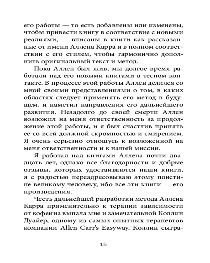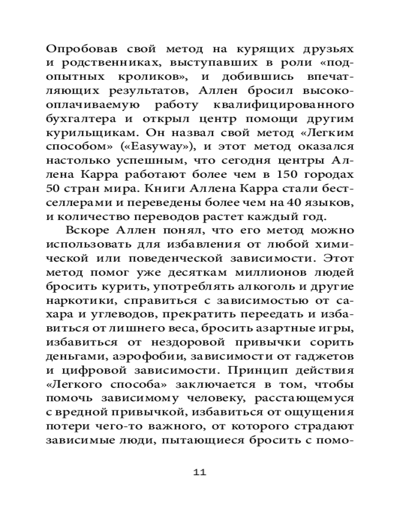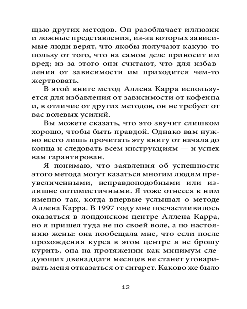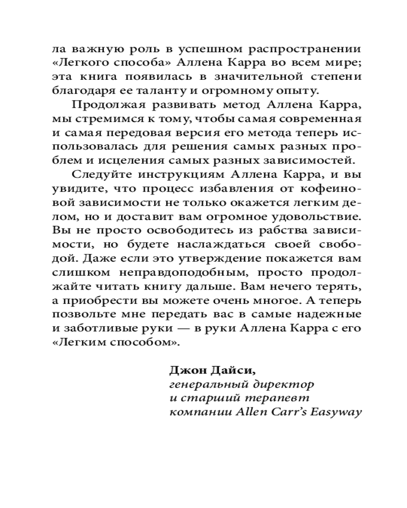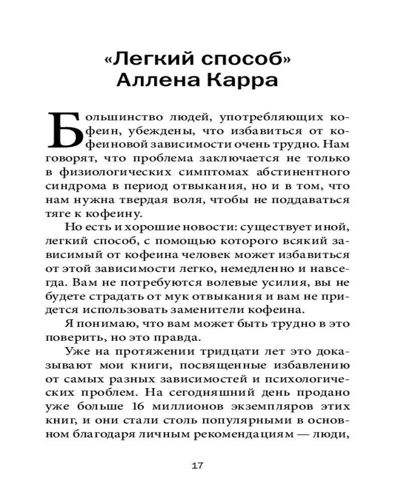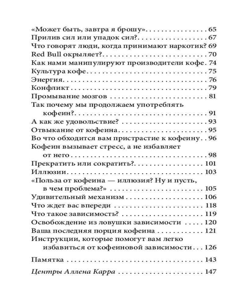 💳 Оплатить за товар можно при получении 🇰🇿 Есть бесплатная доставка по Казахстану от 1 дня 🎁 Копите бонусы с каждой покупки Серия: «Легкий способ» Аллена Карра Мы редко задумываемся о том, что кофеин, содержащийся в кофе и так называемых «энергетических» напитках, — это коварный наркотик, вызывающий сильное привыкание и контролирующий наше поведение и нашу жизнь подобно никотину и алкоголю. Употреблять кофеиносодержащие продукты и напитки — все равно что постоянно занимать деньги до зарплаты: получая быструю «встряску» вместо должного восстановления сил, мы подсаживаемся на такую возможность и расплачиваемся за это подорванным здоровьем, хронической усталостью и расшатанными нервами. |