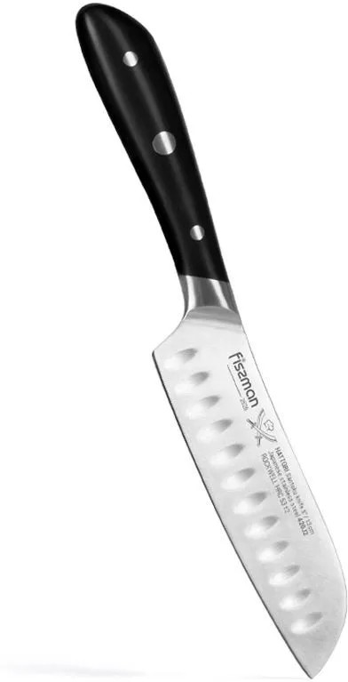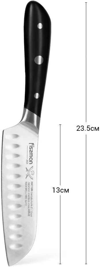 Нож Сантоку — многофункциональное изделие. Предназначено для шинковки овощей, тонкой нарезки, разделки мяса и рыбы. Углубления на поверхности облегчают использование: в них при нарезке остается воздух, поэтому продукты не налипают на лезвие.