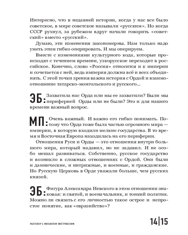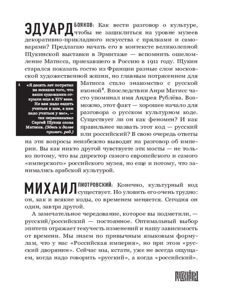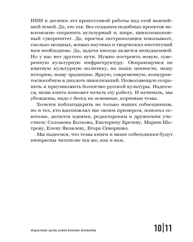 Русский культурный код — загадка, как и понятие «русская душа», разгадать которую пыталось не одно поколение. Сегодня перед российским обществом встает кризисный вызов культурной самоидентификации, передачи эстетической информации и духовных смыслов от поколения к поколению. Говоря о традиции и наследии, нельзя упускать из вида образ будущего, цель, чтобы правильно ставить задачи и выбирать смыслы, пути и средства. 10 деятелей культуры высказали свое мнение о современной культурной политике в беседах с Эдуардом Бояковым и Вероникой Пономарёвой.