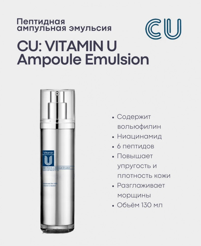 Cu Skin Эмульсия для лица пептиднаяВ данный момент этот товар отсутствует в продаже. Возможно, у нас найдется аналогичный или похожий товар здесь. Серия: Vitamin U Концентрированное средство для антивозрастного ухода 2-в-1 работает как ампула и лёгкая кремовая эмульсия. Комплекс из 6 пептидов запускает синтез коллагена, улучшает эластичность и упругость кожи, вольюфилин заполняет морщины, возвращает потерянный объём за счет эффекта липофилинга, ниацинамид снимает воспаления, осветляет пигментацию, витамин U восстанавливает поврежденную кожу. Инновационная формула предотвращает трансэпидермальную потерю воды. Нежная текстура тает при нанесении, быстро впитывается, не оставляет липкости, комфортна для любого типа кожи, включая жирную и комбинированную. |