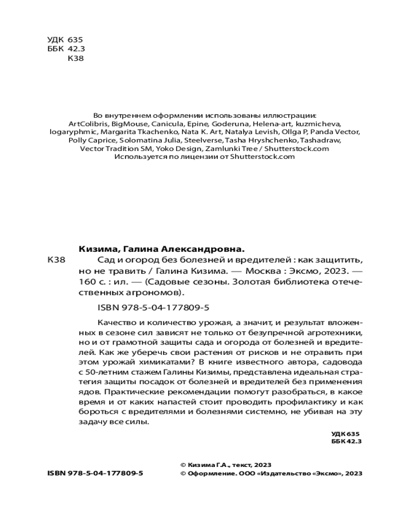 💳 Оплатить за товар можно при получении 🇰🇿 Есть бесплатная доставка по Казахстану от 1 дня 🎁 Копите бонусы с каждой покупки Серия: Садовые сезоны. Золотая библиотека отечественных агрономов Одна из основных задач всех дачников в каждом посевном сезоне — уберечь свой сад и огород от нашествия вредителей и не дать болезням погубить урожай. Как уберечь растения от рисков, но при этом не отравить урожай химикатами? В книге известного автора, садовода с 50-летним стажем Галины Кизимы представлена идеальная стратегия защиты от болезней и вредителей без применения ядов. Практические рекомендации помогут разобраться, в какое время и от каких напастей стоит проводить профилактику и как бороться с вредителями и болезнями системно, не убивая на эту задачу все силы. |