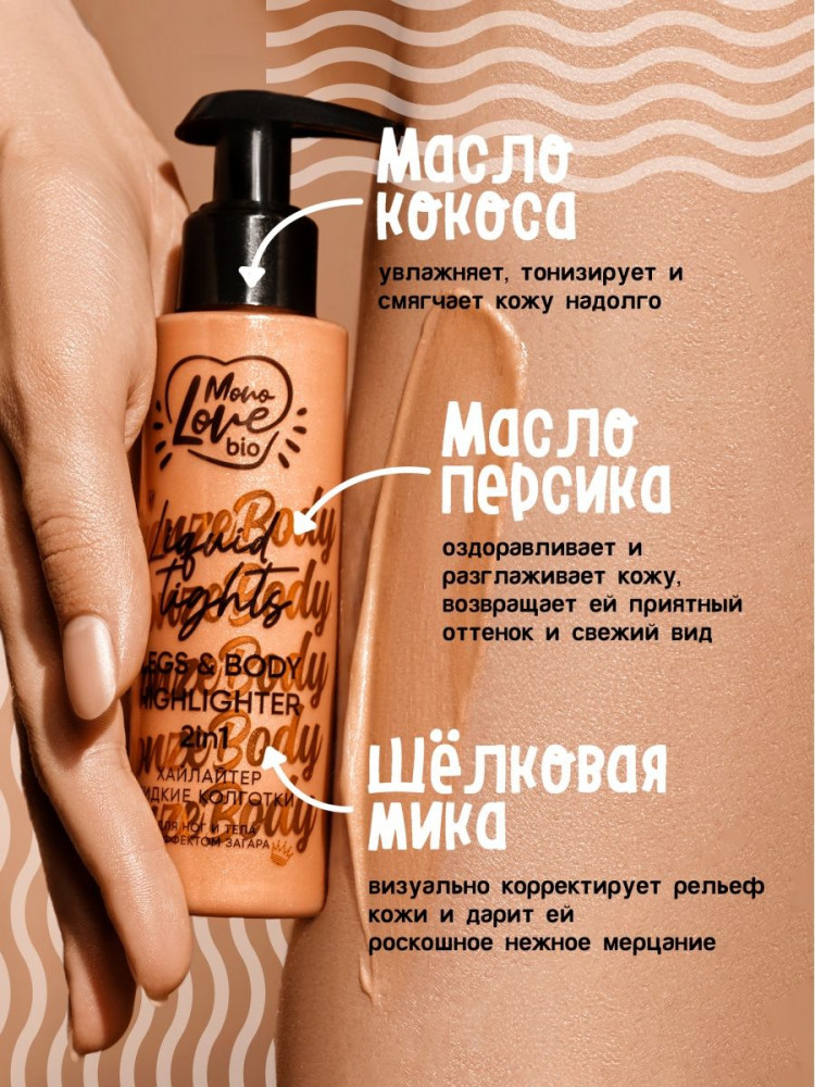 MonoLove Лосьон-хайлайтер для ног и тела «Жидкие колготки»В данный момент этот товар отсутствует в продаже. Возможно, у нас найдется аналогичный или похожий товар здесь. Твои ножки сведут с ума и станут поводом для зависти! Эффект естественного загара, лёгкое деликатное сияние — ты можешь использовать средство и как жидкие колготки для ног, и как хайлайтер для тела — сногсшибательный образ обеспечен! |