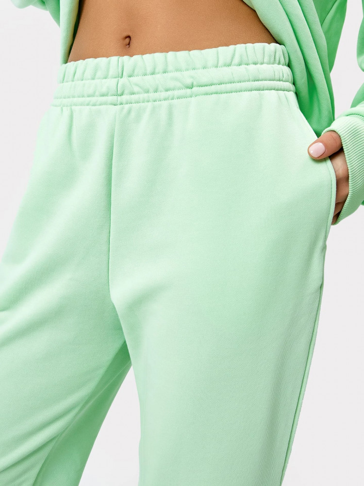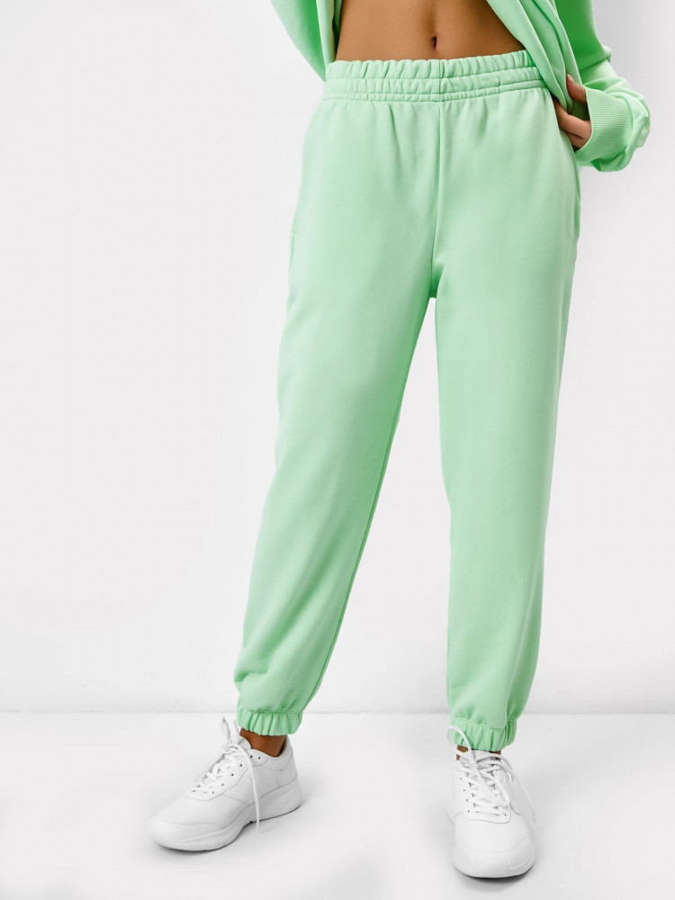 Уютные брюки силуэта оверсайз. Фактура материала — футер. Пояс с эластичной тесьмой внутри. Есть боковые карманы. Штанины завершаются манжетами с эластичной тесьмой. Удобно!