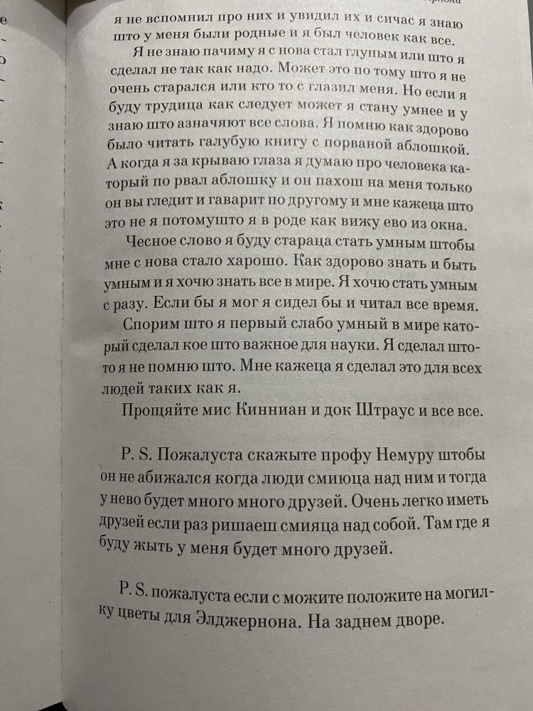 автор выбрал идеальный стиль писания и повествования от лица главного героя. очень интересная и хорошая книга, автор прекрасно передаёт мысли и чувства Чарли, что мы вместе с ним переживаем все моменты
