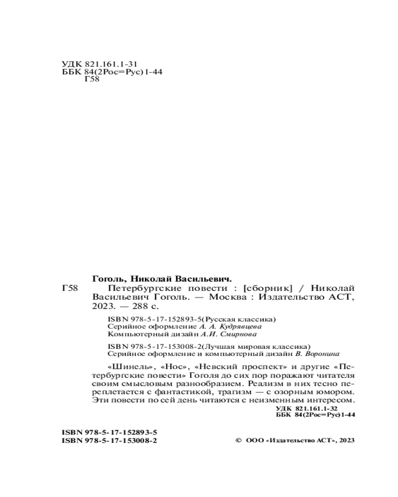 Петербургские повестиВ данный момент этот товар отсутствует в продаже. Возможно, у нас найдется аналогичный или похожий товар здесь. Серия: Русская классика «Шинель», «Нос», «Невский проспект» и другие «Петербургские повести» Гоголя до сих пор поражают читателя своим смысловым разнообразием. Реализм в них тесно переплетается с фантастикой, трагизм с озорным юмором. Эти повести по сей день читаются с неизменным интересом. |