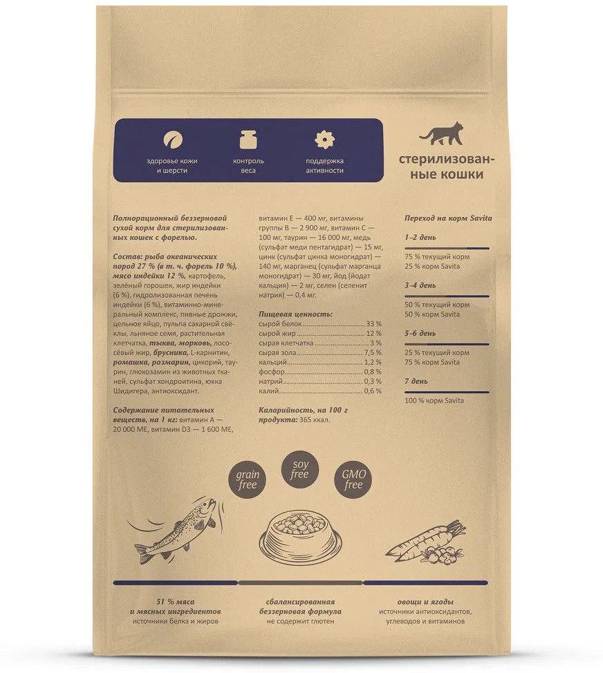 Долго искала корм, взамен зарубежных, без содержания пшеницы, кукурузы и глютена. У Blitz holistic к сожалению только 2 вкуса. Остановились на Savita. Пока норм, едят.
