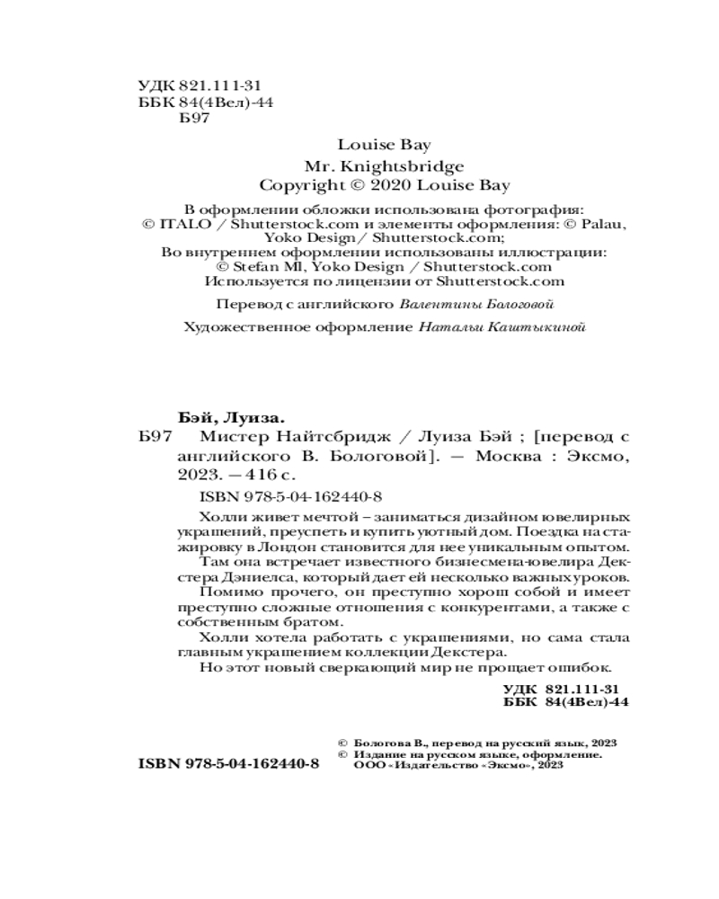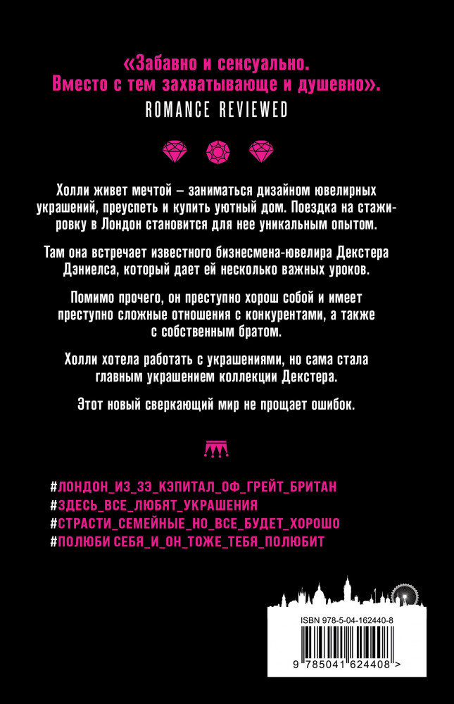 Серия: Мистер Икс. Это любовь Холли живет мечтой — заниматься дизайном ювелирных украшений, преуспеть и купить уютный дом. Поездка на стажировку в Лондон становится для нее уникальным опытом. Там она встречает известного бизнесмена-ювелира Декстера Дэниелса, который дает ей несколько важных уроков. Помимо прочего, он преступно хорош собой и имеет преступно сложные отношения с конкурентами, а также с собственным братом. Холли хотела работать с украшениями, но сама стала главным украшением коллекции Декстера. Но этот новый сверкающий мир не прощает ошибок. |
