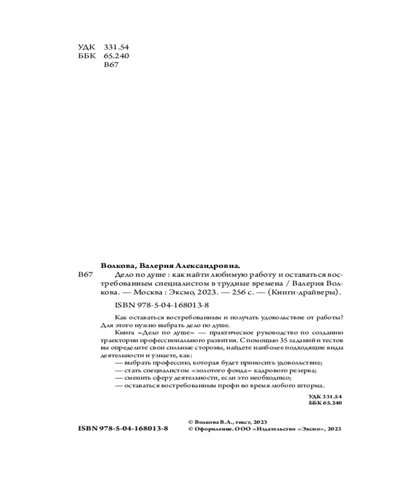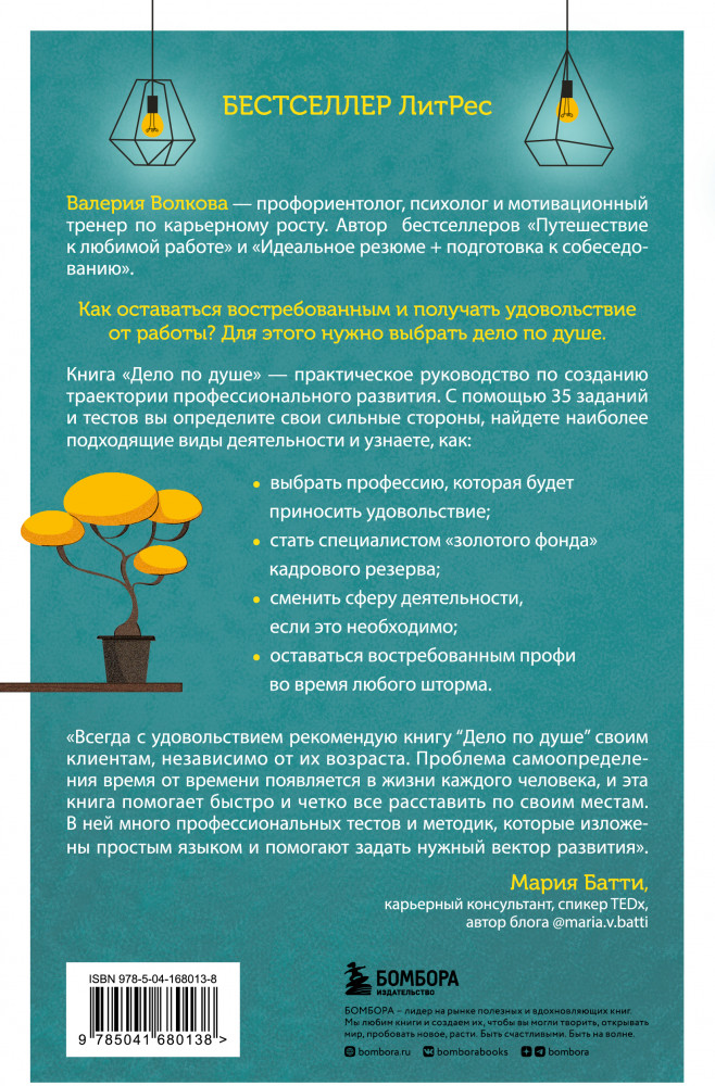 Дело по душе. Как найти любимую работу и оставаться востребованным специалистом в трудные временаВ данный момент этот товар отсутствует в продаже. Возможно, у нас найдется аналогичный или похожий товар здесь. Серия: Книги-драйверы Валерия Волкова — профориентолог, психолог и мотивационный тренер по карьерному росту. Автор нескольких бестселлеров «Путешествие к любимой работе» и «Идеальное резюме + подготовка к собеседованию». Как оставаться востребованным и получать удовольствие от работы? Для этого нужно выбрать дело по душе. |