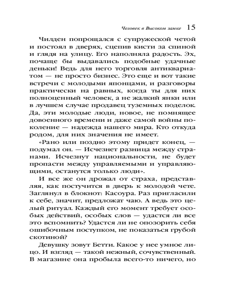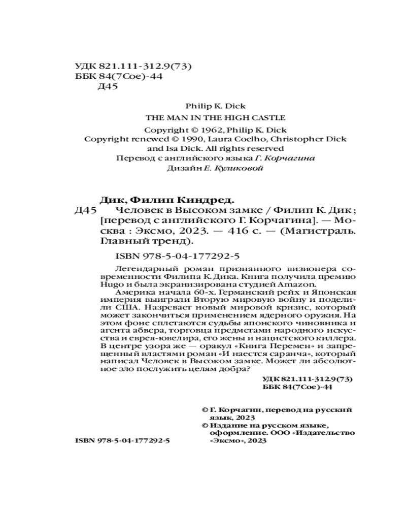 💳 Оплатить за товар можно при получении 🇰🇿 Есть бесплатная доставка по Казахстану от 1 дня 🎁 Копите бонусы с каждой покупки Серия: Магистраль. Главный тренд Германский рейх и Японская империя выиграли Вторую мировую войну и разделили Америку. Наступили 60-е, годы стабильности и благополучия. Назревает конфликт между державами, который может привести к ядерной войне. На этом фоне сплетаются линии судеб японского чиновника и агента абвера, торговца предметами народного искусства и еврея-ювелира, его свободолюбивой жены и нацистского киллера. В центре узора — мистический оракул «Книга Перемен» и запрещенная властями рейха книга «И наестся саранча», написанная Человеком в Высоком замке. Кто из них даст ответ на вопрос: может ли абсолютное зло творить добро? |