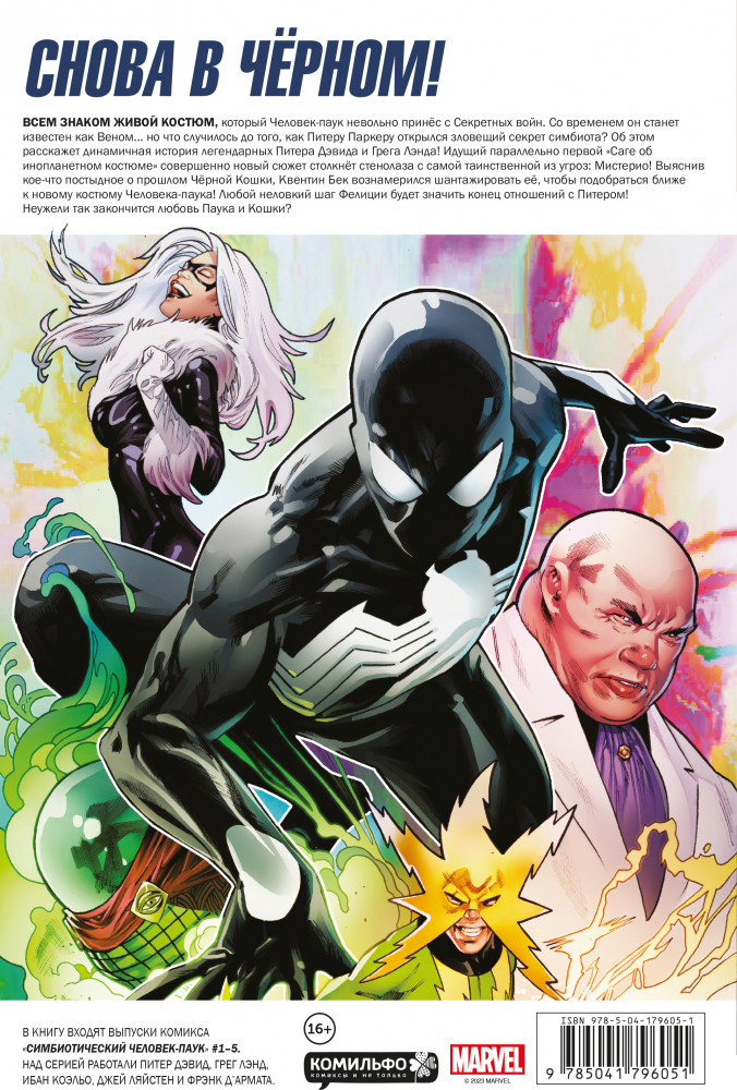 В данный момент этот товар отсутствует в продаже. Возможно, у нас найдется аналогичный или похожий товар здесь. Серия: Человек-Паук. Избранное (обложка) Всем знаком живой костюм, который Человек-паук невольно принёс с Секретных войн. Со временем он станет известен как Веном... но что случилось до того, как Питеру Паркеру открылся зловещий секрет симбиота? Об этом расскажет динамичная история легендарных Питера Дэвида и Грега Лэнда! Идущий параллельно первой «Саге об инопланетном костюме» совершенно новый сюжет столкнёт стенолаза с самой таинственной из угроз: Мистерио! Выяснив кое-что постыдное о прошлом Чёрной Кошки, Квентин Бек вознамерился шантажировать её, чтобы подобраться ближе к новому костюму Человека-паука! Любой неловкий шаг Фелиции будет значить конец отношений с Питером! Неужели так закончится любовь Паука и Кошки?