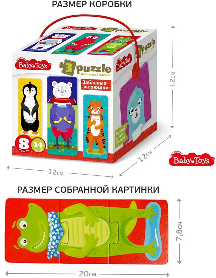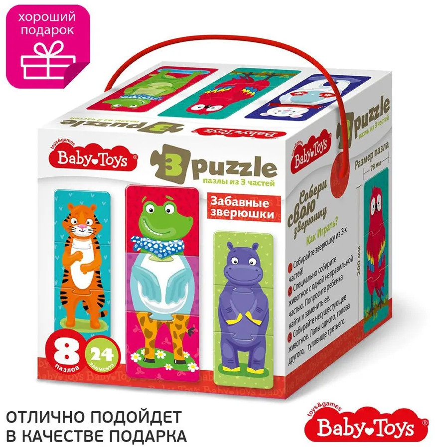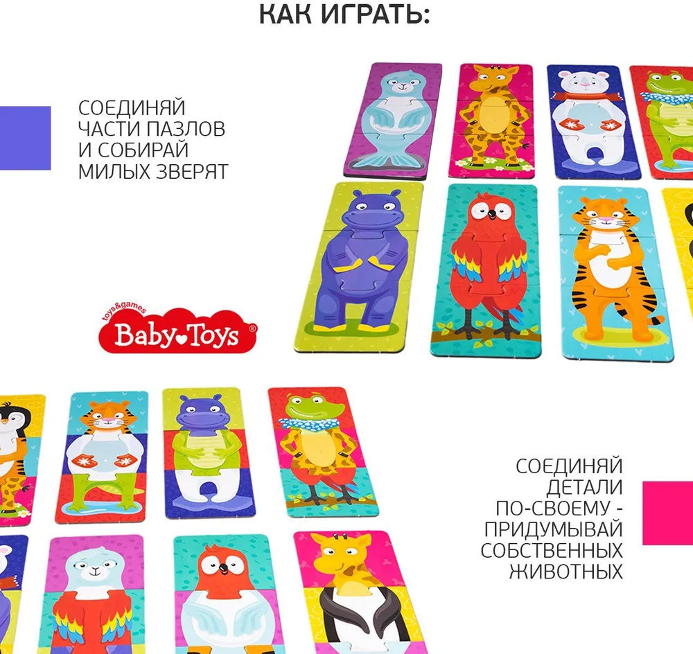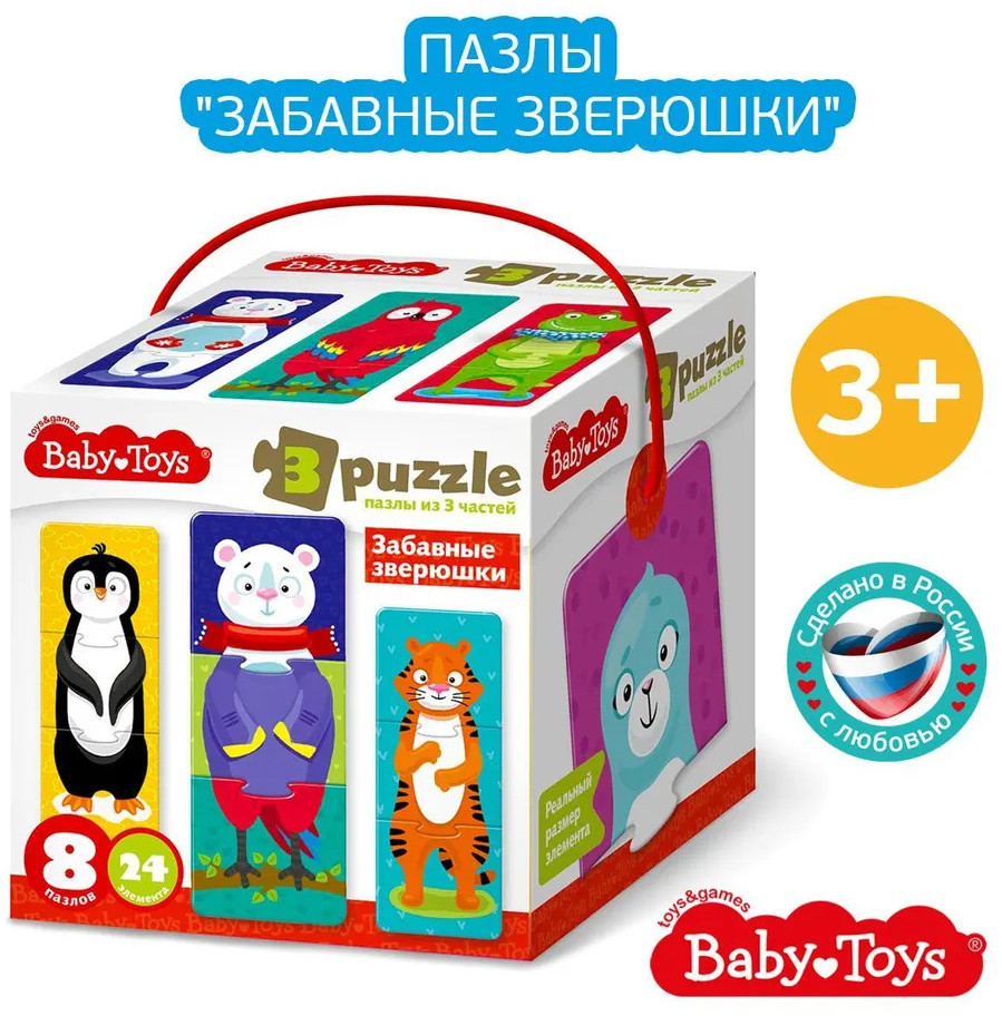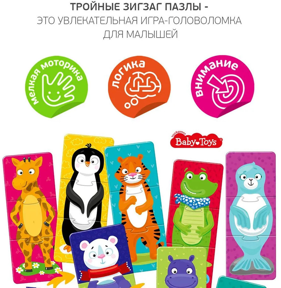 Тройные зигзаг пазлы «Забавные зверюшки» — это увлекательная игра-головоломка для малышей. Соединяя части изображения, ребёнок сможет собрать изображения зверей, или придумать новый вид животных, соединив разные пазлы. Яркие картинки, выполненные из высококачественного многослойного картона толщиной более 2 мм, благодаря чему элементы не теряют форму и остаются ровными. Лицевая сторона элементов защищена слоем специального экологически чистого покрытия, который препятствует быстрому истиранию и выцветанию цветных картинок. Пазлы доставят вашему ребенку радость и помогут в познании окружающего мира.