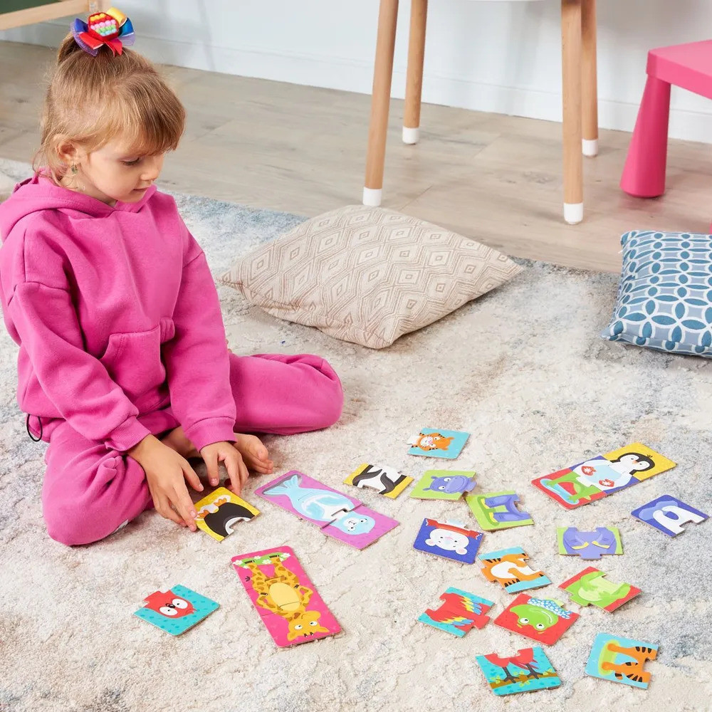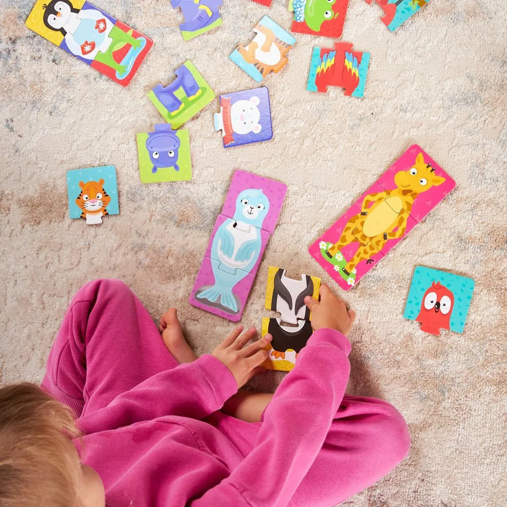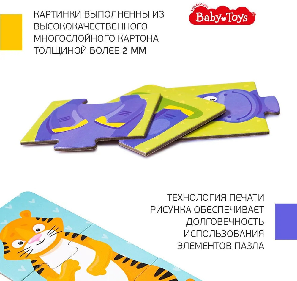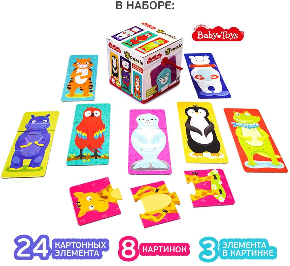 Тройные зигзаг пазлы «Забавные зверюшки» — это увлекательная игра-головоломка для малышей. Соединяя части изображения, ребёнок сможет собрать изображения зверей, или придумать новый вид животных, соединив разные пазлы. Яркие картинки, выполненные из высококачественного многослойного картона толщиной более 2 мм, благодаря чему элементы не теряют форму и остаются ровными. Лицевая сторона элементов защищена слоем специального экологически чистого покрытия, который препятствует быстрому истиранию и выцветанию цветных картинок. Пазлы доставят вашему ребенку радость и помогут в познании окружающего мира.