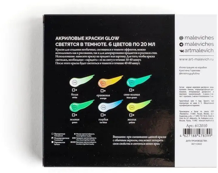 💳 Оплатить за товар можно при получении 🇰🇿 Есть бесплатная доставка по Казахстану от 1 дня 🎁 Копите бонусы с каждой покупки Серия: Glow Главной особенностью акриловой краски Glow от бренда «Малевичъ» является то, что она светится в темноте. В остальном краски обладают всеми качествами акрила — мягкая текстура, которая позволяет наносить краску на бумагу, холст и другие поверхности, после высыхания образует прочную водооталкивающую плёнку, хорошая укрывистость и яркие насыщенные цвета. С акрилом Glow вы можете экспериментировать, создавая отдельные детали в ваших работах или полноценные работы, которые будут раскрываться и играть новыми цветами в темноте. |