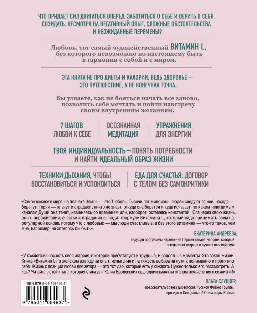 💳 Оплатить за товар можно при получении 🇰🇿 Есть бесплатная доставка по Казахстану от 1 дня 🎁 Копите бонусы с каждой покупки Серия: Бордовских Юлия. Вдохновляющие книги от телеведущей и коуча по здоровому образу жизни Журналистка и телеведущая Юлия Бордовских предлагает взглянуть на свое здоровье сквозь призму любви, открыть в себе это чувство и с его помощью наполниться энергией. Личный опыт, извлеченный из кризисных жизненных ситуаций, встречи с удивительными людьми, изменившими ее отношение к привычным вещам, знания, полученные во время учебы на тренера по здоровью, простые и эффективные упражнения для знакомства с собственной внутренней вселенной — об этом и многом другом она рассказывает в книге «Витамин L». |