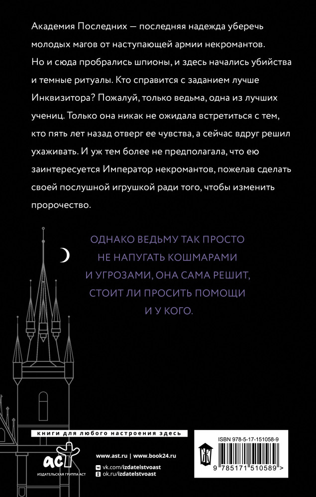 Серия: Мрачные сказки Академия Последних — последняя надежда уберечь молодых магов от наступающей армии некромантов. Но и сюда пробрались шпионы, и здесь начались убийства и темные ритуалы. Кто справится с заданием лучше Инквизитора? Пожалуй, только ведьма, одна из лучших учениц. Только она никак не ожидала встретиться с тем, кто пять лет назад отверг ее чувства, а сейчас вдруг решил ухаживать. И уж тем более не предполагала, что ею заинтересуется Император некромантов, пожелав сделать своей послушной игрушкой ради того, чтобы изменить пророчество. |