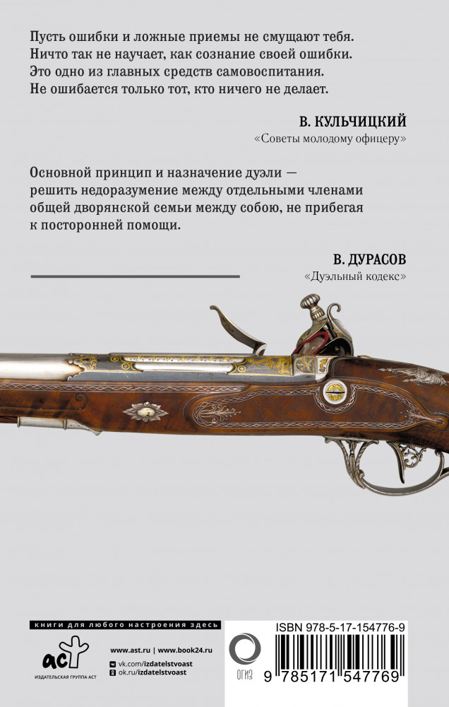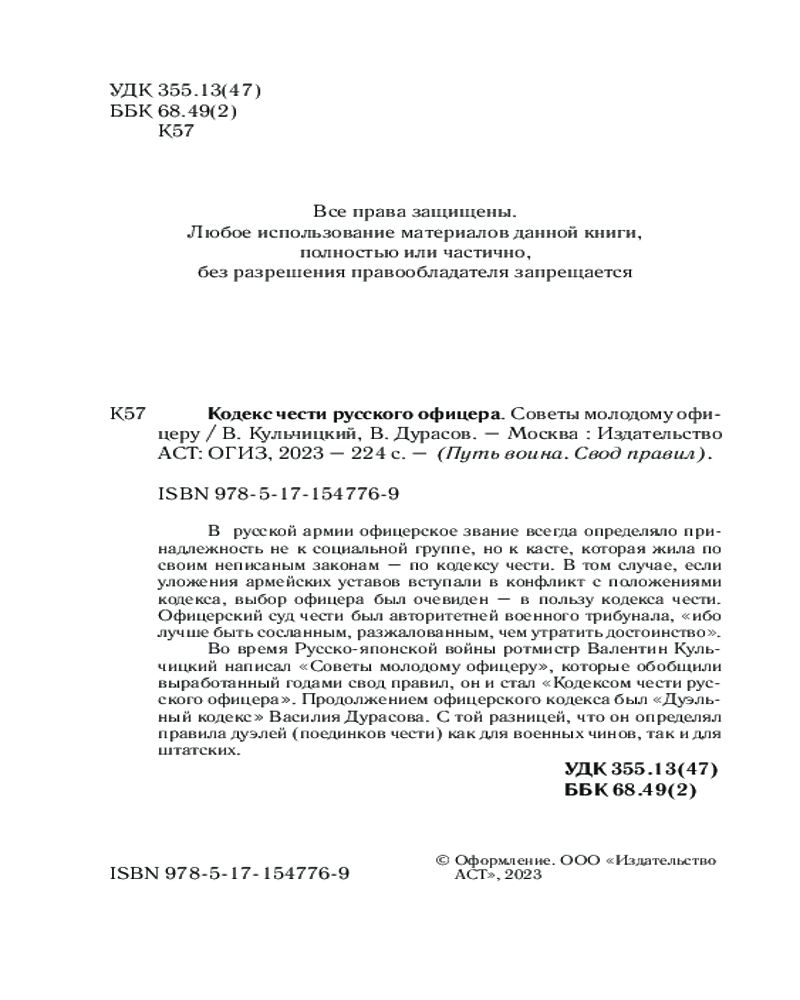 💳 Оплатить за товар можно при получении 🇰🇿 Есть бесплатная доставка по Казахстану от 1 дня 🎁 Копите бонусы с каждой покупки Серия: Путь воина. Свод правил В русской армии офицерское звание всегда определяло принадлежность не к социальной группе, но к касте, которая жила по своим неписаным законам — по кодексу чести. В том случае, если уложения армейских уставов вступали в конфликт с положениями кодекса, выбор офицера был очевиден — в пользу кодекса чести. Офицерский суд чести был авторитетней военного трибунала, «ибо лучше быть сосланным, разжалованным, чем утратить достоинство». |