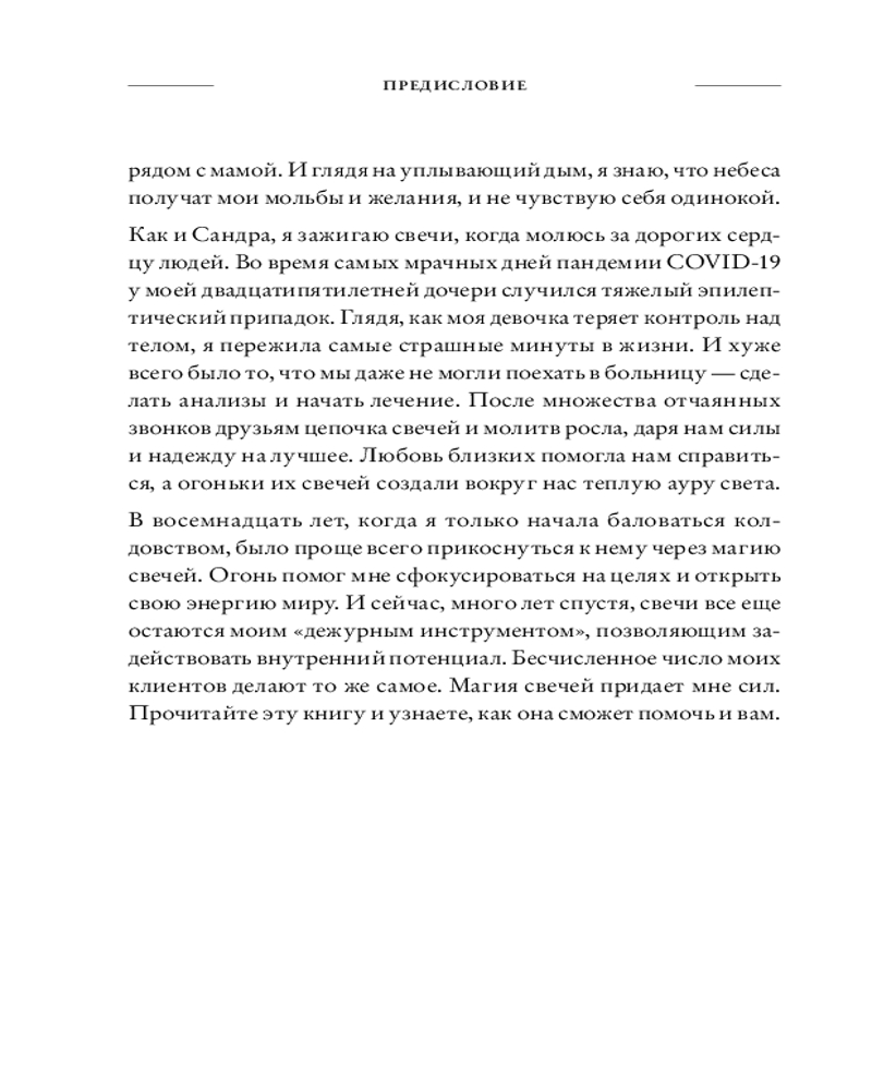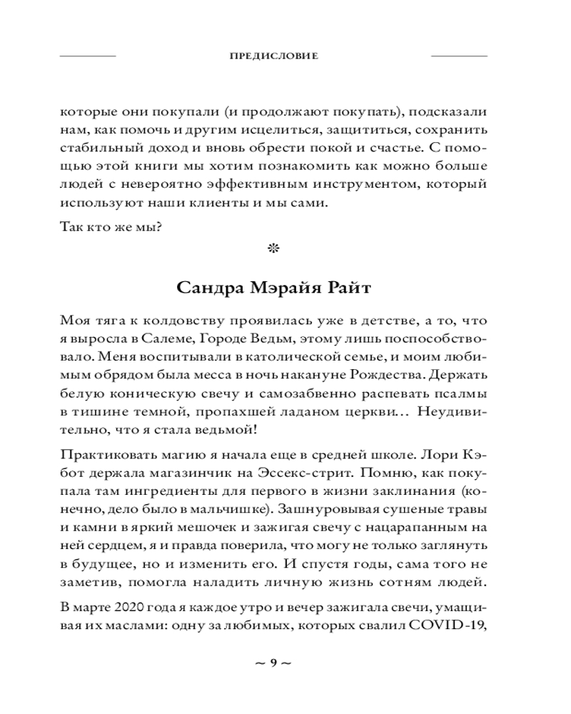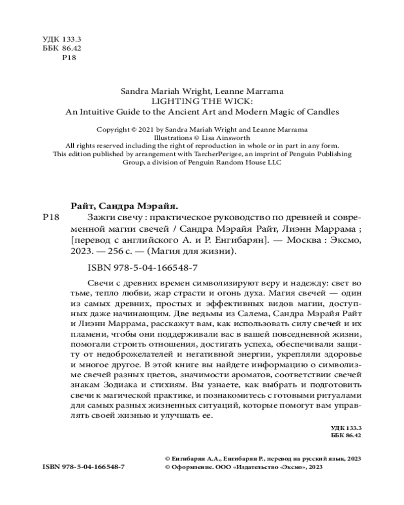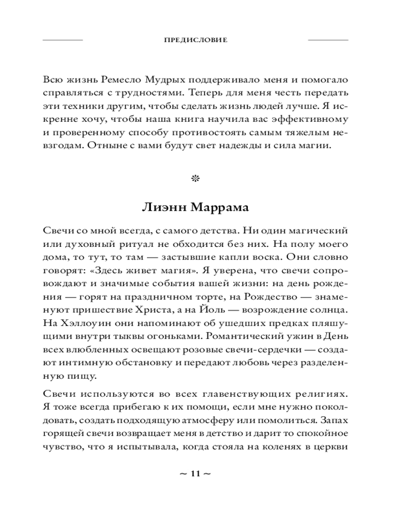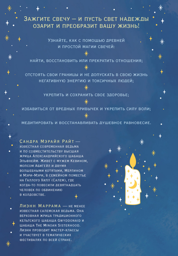 Магия свечей — один из самых древних, простых и эффективных видов магии, и доступна даже начинающим. Две ведьмы из Салема, Сандра Мэрайя Райт и Лиэнн Маррама, расскажут вам, как использовать силу свечей и их пламени, чтобы они поддерживали вас в вашей повседневной жизни. В этой книге вы найдете информацию о символизме свечей разных цветов, значимости ароматов, соответствии свечей знакам Зодиака и стихиям. Вы узнаете, как выбрать и подготовить свечи к магической практике, и познакомитесь с готовыми ритуалами для самых разных жизненных ситуаций.