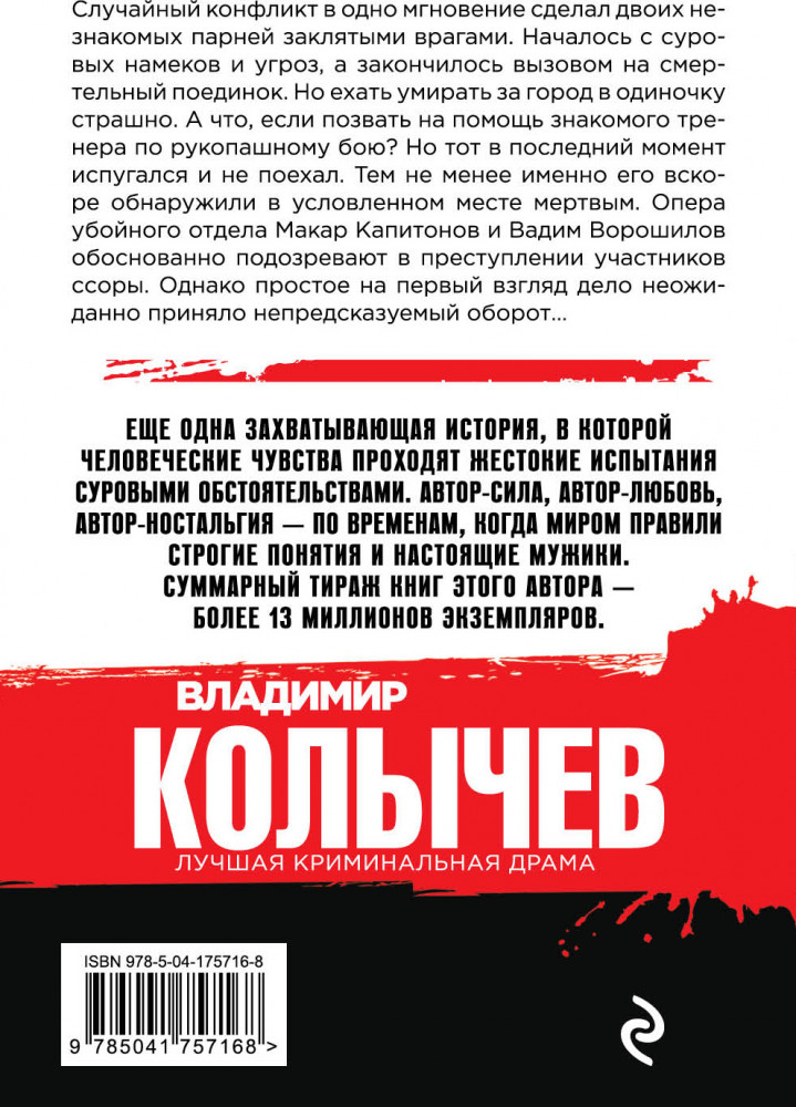 В данный момент этот товар отсутствует в продаже. Возможно, у нас найдется аналогичный или похожий товар здесь. Серия: Колычев. Лучшая криминальная драма (обложка) Случайный конфликт в одно мгновение сделал двоих незнакомых парней заклятыми врагами. Началось с суровых намеков и угроз, а закончилось вызовом на смертельный поединок. Но ехать умирать за город в одиночку страшно. А что, если позвать на помощь знакомого тренера по рукопашному бою? Но тот в последний момент испугался и не поехал. Тем не менее, именно его вскоре обнаружили в условленном месте мертвым. Опера убойного отдела Макар Капитонов и Вадим Ворошилов обоснованно подозревают в преступлении участников ссоры. Однако простое, на первый взгляд, дело неожиданно приняло непредсказуемый оборот...