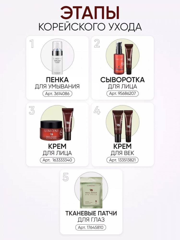 Крем для кожи вокруг глаз: snail secretion filtrate , cetearyl olivate(and)sorbitan olivate , glyceryl stearate , phytosqualane , beeswax , limnanthes alba (meadowfoam) seed oil, niacinamide, water (and) sodium hyaluronate , betula platyphylla japonica juice, stearic acid, polyacrylate-13 (and) polyisobutene (and) polysorbate, dimethicone, butylene glycol,portulaca oleracea extract, prunus amygdalus dulcis (sweet almond) seed extract, glycerin, hydrolyzed wheat protein , water(and)palmitoyl pentapeptide-4 , epidermal growth factor , glyceryl stearate (and) peg-100 stearate , octyldodecyl myristate , cetearyl alcohol , adenosine, disodium edta, phenoxyethanol, methylparaben , propylparaben.