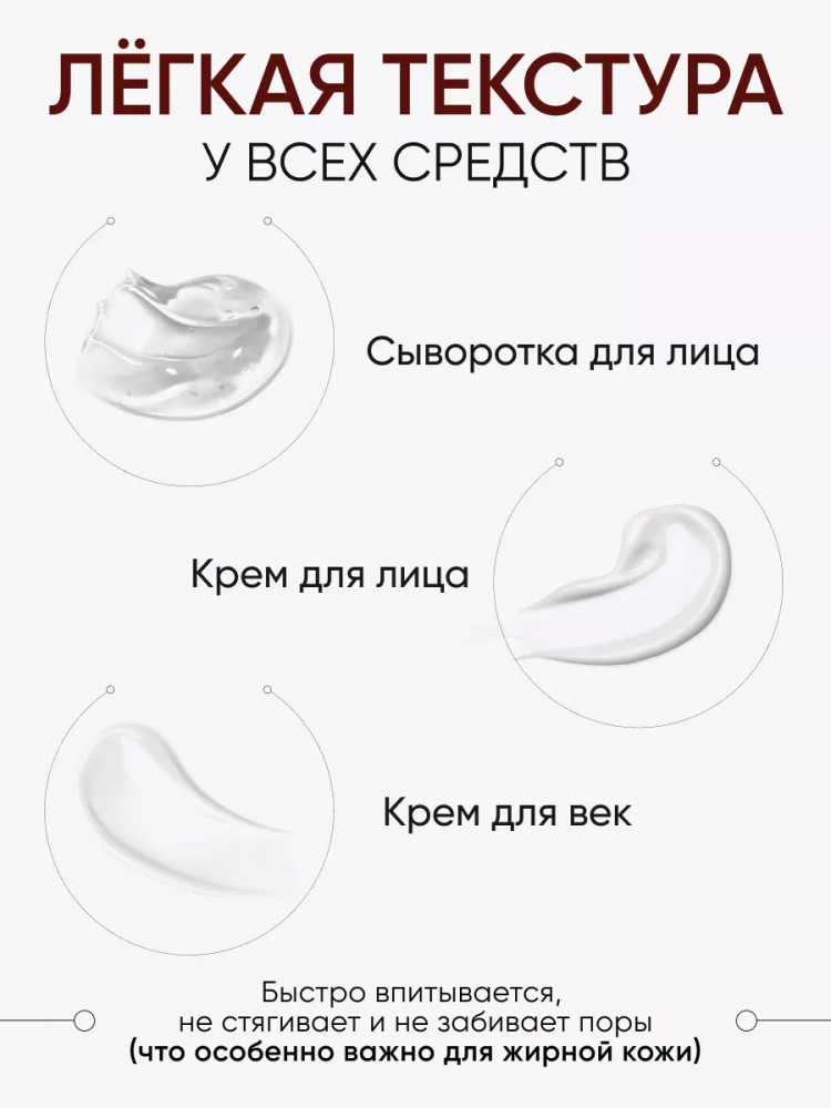 Сыворотка: Water, Butylene Glycol, Glycerin, Alcohol, Glycereth-26, Panthenol, Carbomer, Triethanolamine, Ethylhexylglycerin, Caprylyl Glycol, Trehalose, Sodium Polyacrylate, Adenosine, Tropolone, Sodium Hyaluronate, Punica Granatum Fruit Extract, Theobroma Cacao(Cocoa) Extract, Disodium EDTA, 1,2-Hexanediol, Coptis Chinensis Root Extract, Nelumbo Nucifera Flower Extract, Copper Tripeptide-1, Cornus Officinalis Fruit Extract, Palmitoyl Pentapeptide-4, Rh-Oligopeptide-1.