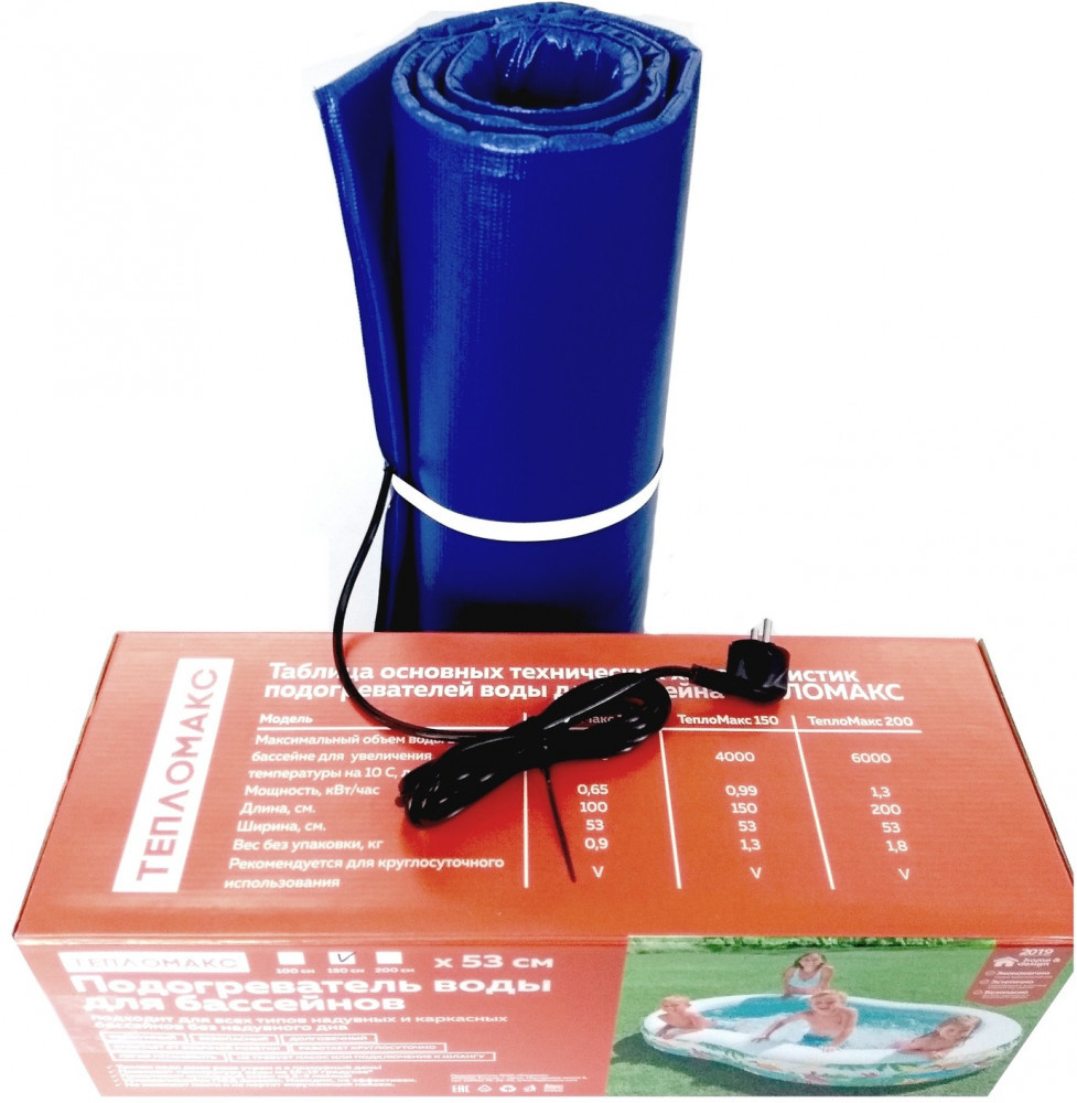 Электроподогреватель для воды в надувных, каркасных, полипропиленовых бассейнах из ПВХ без надувного дна. Электроподогреватель ТеплоМакс 150 работает от стандартной бытовой сети 220 В и обеспечивает нагрев воды на 10-15 градусов. На прогрев максимального объема воды до максимальной температуры потребуется примерно 24 часа. Обогреватель рассчитан на круглосуточную работу в течении всего дачного сезона, с весны до осени. В целях экономии его можно выключать в жаркие дни или в летние ночи, когда происходит основное понижение температуры воды.