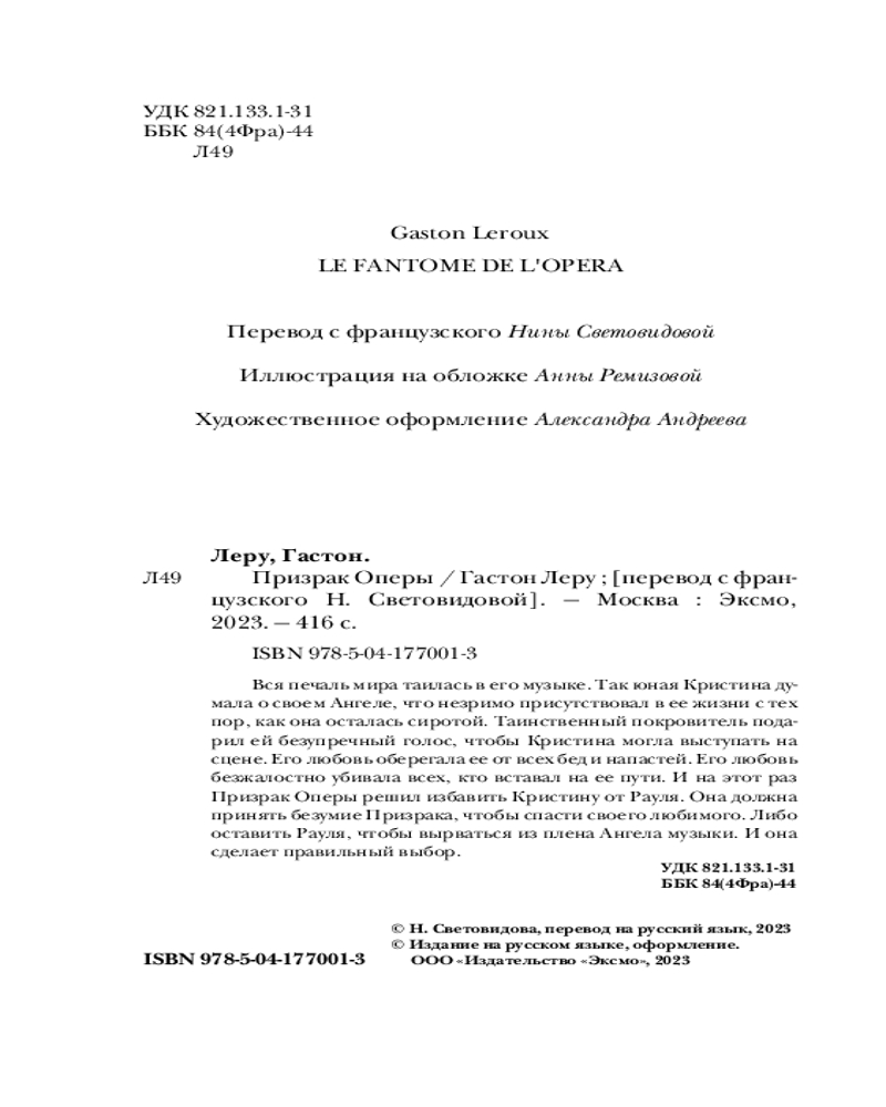 "Призрак Оперы" (Гастон Леру) изд-во "Like Book" - именно у этого издательства на твёрдом переплёте красиво отражён сюжет книги! Хорошие белые страницы, чёткий шрифт. Человек, обладающий великолепным голосом, но весьма некрасивый внешне, стал призраком, чтобы никто не видел его внешность. Он полюбил Кристину, и так далее... Трагический конец истории. В конце книги есть эпилог с пояснениями. Эта трагическая история любви основана на действительных фактах. Великолепная книга великолепного писателя, отлично изданная!
