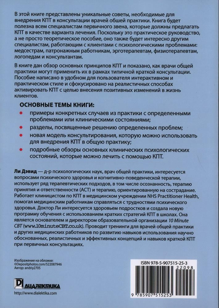 💳 Оплатить за товар можно при получении 🇰🇿 Есть бесплатная доставка по Казахстану от 1 дня 🎁 Копите бонусы с каждой покупки В этой книге представлены уникальные советы, необходимые для внедрения КПТ в консультации врачей обшей практики. Книга будет полезна всем специалистам первичного звена, которые должны предлагать КПТ в качестве варианта лечения. Поскольку это практическое руководство, а не просто теоретическое пособие, оно также будет интересно другим специалистам, работающим с клиентами с психологическими проблемами: медсестрам, патронажным работникам, эрготерапевтам, физиотерапевтам, логопедам и консультантам. |