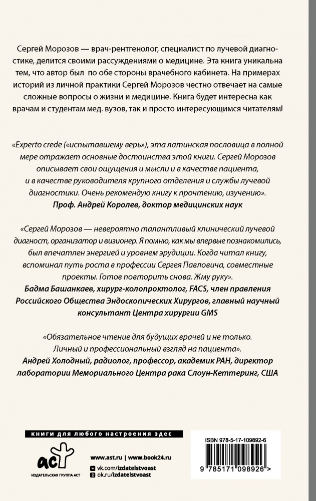 💳 Оплатить за товар можно при получении 🇰🇿 Есть бесплатная доставка по Казахстану от 1 дня 🎁 Копите бонусы с каждой покупки Серия: Звезда соцсети Автор книги, Сергей Морозов — врач-рентгенолог, главный специалист по лучевой диагностике, рассуждает о медицине как философском подходе к жизни, об универсальном диагностическом подходе к ней. Что общего между врачом и топ-менеджером крупной компании? В чем сущность медицинского подхода к жизни и бизнесу? Почему интересны рассуждения о медицине как философии? |