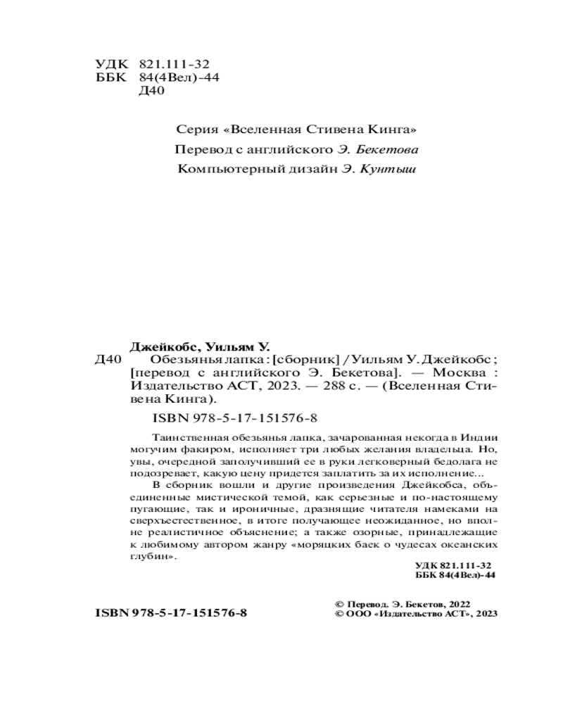 В данный момент этот товар отсутствует в продаже. Возможно, у нас найдется аналогичный или похожий товар здесь. Серия: Вселенная Стивена Кинга Таинственная обезьянья лапка, зачарованная некогда в Индии могучим факиром, исполняет три любых желания владельца. Но, увы, очередной заполучивший ее в руки легковерный бедолага не подозревает, какую цену придется заплатить за их исполнение...