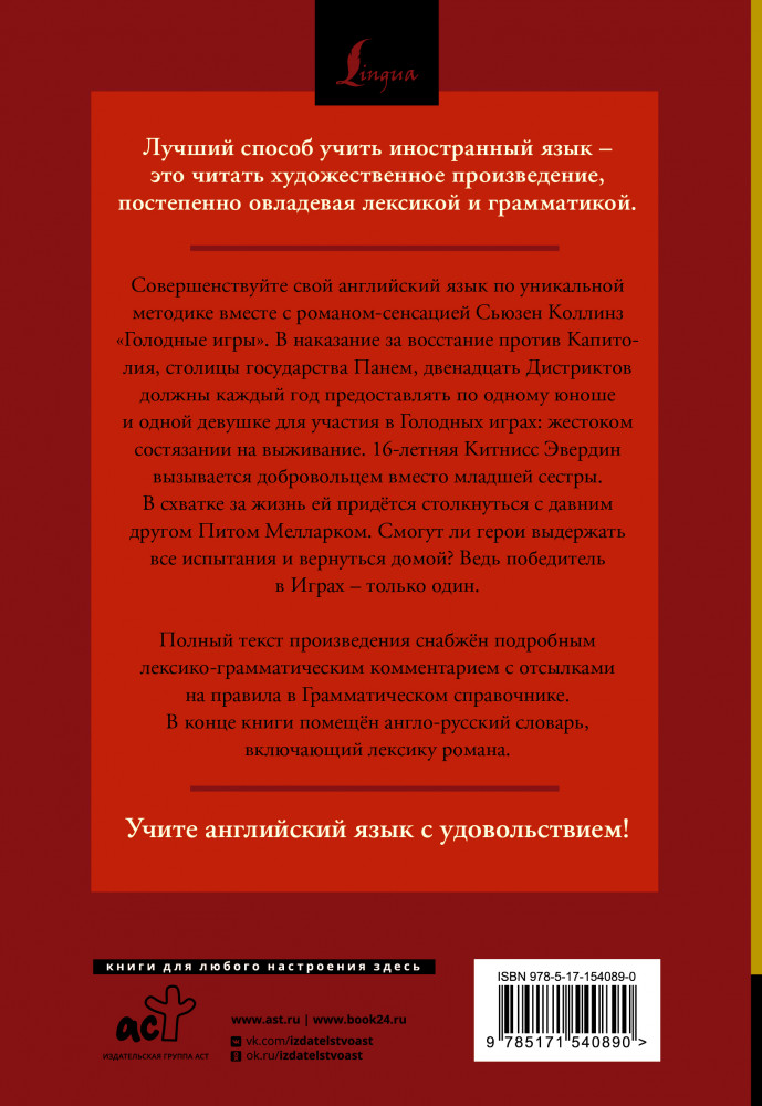 Совершенствуйте свой английский язык по уникальной методике вместе с романом-сенсацией американской писательницы Сьюзен Коллинз «Голодные игры». В наказание за восстание против Капитолия, столицы государства Панем, двенадцать Дистриктов должны каждый год предоставлять по одному юноше и одной девушке для участия в Голодных играх: жестоком состязании на выживание. 16-летняя Китнисс Эвердин вызывается добровольцем вместо младшей сестры. В схватке за жизнь ей придётся столкнуться с давним другом Питом Мелларком. Смогут ли герои выдержать все испытания и вернуться домой? Ведь победитель в Играх — только один.