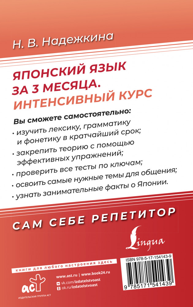 💳 Оплатить за товар можно при получении 🇰🇿 Есть бесплатная доставка по Казахстану от 1 дня 🎁 Копите бонусы с каждой покупки Серия: Сам себе репетитор Надежкина Надежда Владимировна — автор множества справочных и учебных пособий по японскому языку, чья методика позволяет овладеть языком быстро и качественно. |
