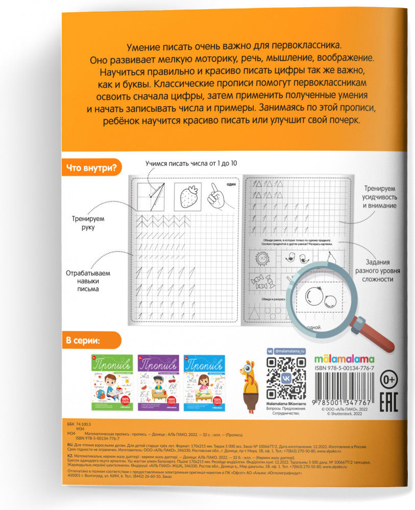 Пропись. Математическая прописьВ данный момент этот товар отсутствует в продаже. Возможно, у нас найдется аналогичный или похожий товар здесь. Умение писать очень важно для первоклассника. Оно развивает мелкую моторику, речь, мышление, воображение. Научиться правильно и красиво писать цифры так же важно, как и буквы. Классические прописи помогут первоклассникам освоить сначала цифры, затем применить полученные умения и начать записывать числа и примеры. Занимаясь по этой прописи, ребёнок научиться красиво писать или улучшит свой почерк. |