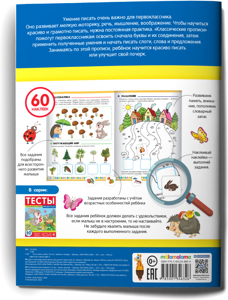 💳 Оплатить за товар можно при получении 🇰🇿 Есть бесплатная доставка по Казахстану от 1 дня 🎁 Копите бонусы с каждой покупки Серия: Тесты. Что я знаю и умею Всестороннее развитие малыша очень важно уже в самом юном возрасте. Развивающее пособие «Что я знаю и умею. 5-6 лет» из серии «Тесты» поможет родителям проверить знания малыша в разных областях и выяснить, на какие из них стоит обратить внимание. В пособии собраны десятки интересных заданий. Оно призвано сделать занятия увлекательными для малыша, чтобы его любознательность только возрастала. Развивайтесь гармонично вместе с Malamalama! |