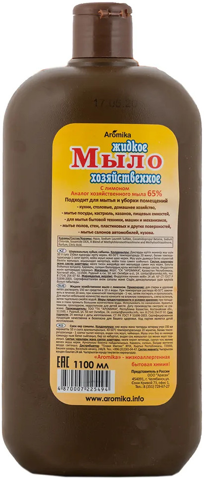 Аромика Мыло хозяйственное «Лимон»+40 большой объём удаляет грязь приятная цена жидкая консистенция слабый запах