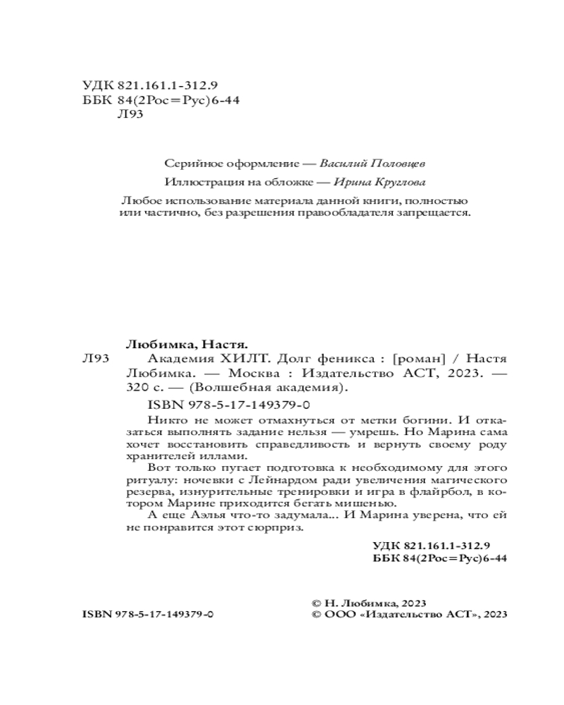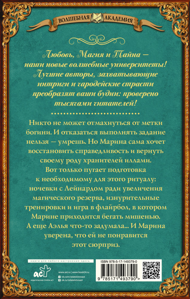 💳 Оплатить за товар можно при получении 🇰🇿 Есть бесплатная доставка по Казахстану от 1 дня 🎁 Копите бонусы с каждой покупки Серия: Волшебная академия Никто не может отмахнуться от метки богини. И отказаться выполнять задание нельзя — умрешь. Но Марина сама хочет восстановить справедливость и вернуть своему роду хранителей иллами. |