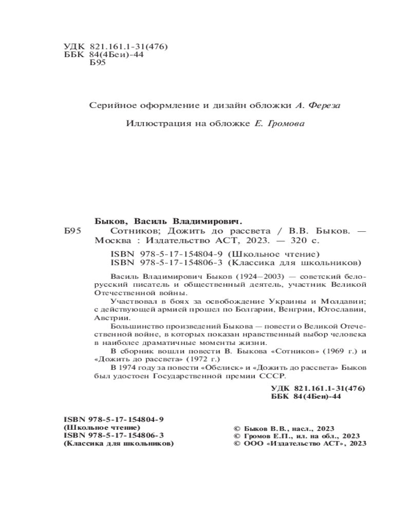💳 Оплатить за товар можно при получении 🇰🇿 Есть бесплатная доставка по Казахстану от 1 дня 🎁 Копите бонусы с каждой покупки Серия: Школьное чтение Василь Владимирович Быков (1924-2003) — советский белорусский писатель и общественный деятель, участник Великой отечественной войны. |