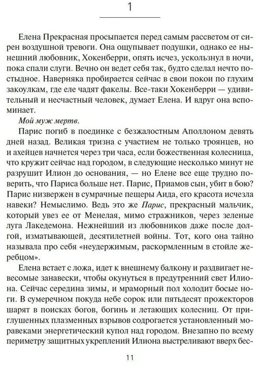 В дилогии «Троя», составленной романами «Илион» и «Олимп», он наконец вернулся к жанру, прославившему его в начале карьеры, — масштабной космической оперы со множеством аллюзий из классической литературы. Здесь разумные роботы-моравеки, прибывшие с лун Юпитера исследовать аномальную квантовую активность Марса, обсуждая в пути сравнительные достоинства Шекспира и Пруста, отправляются к почти обезлюдевшей Земле на ядерно-импульсном корабле «Королева Маб», срочно построенном на Фобосе по передовому слову земной науки образца 1950-х годов, и прихватывают с собой Одиссея собственной персоной; здесь греки и троянцы объединяются против олимпийских богов, пользующихся всеми чудесами нанотехнологии; здесь шекспировский Просперо, он же аватара земной ноосферы, путешествует эйфельбаном от Эвереста до крайней оконечности Португалии, где начинается Атлантическая Брешь... |