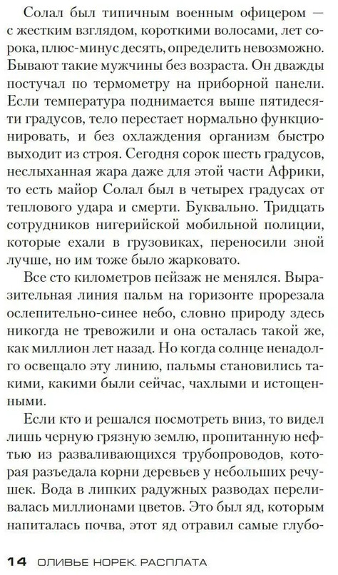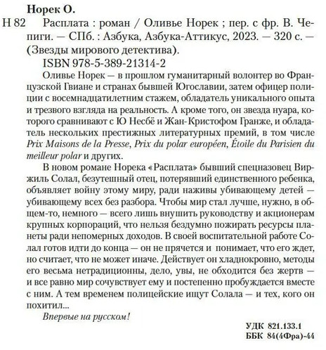 В новом романе Норека «Расплата» бывший спецназовец Виржиль Солал, безутешный отец, потерявший единственного ребенка, объявляет войну этому миру, ради наживы убивающему детей — убивающему всех без разбора. Чтобы мир стал лучше, нужно, в общем-то, немного — всего лишь внушить руководству и акционерам крупных корпораций, что нельзя бездумно пожирать ресурсы планеты ради непомерных доходов. В своей воспитательной работе Солал готов идти до конца — он не прячется и понимает, что его ждет, но считает, что не может иначе. Действует он хладнокровно, методы его весьма нетрадиционны, дело, увы, не обходится без жертв — и все равно мир сочувствует ему и постепенно пробуждается вместе с ним. А тем временем полицейские ищут Солала — и тех, кого он похитил... Впервые на русском! |